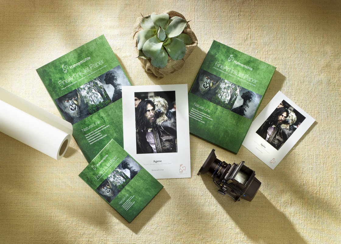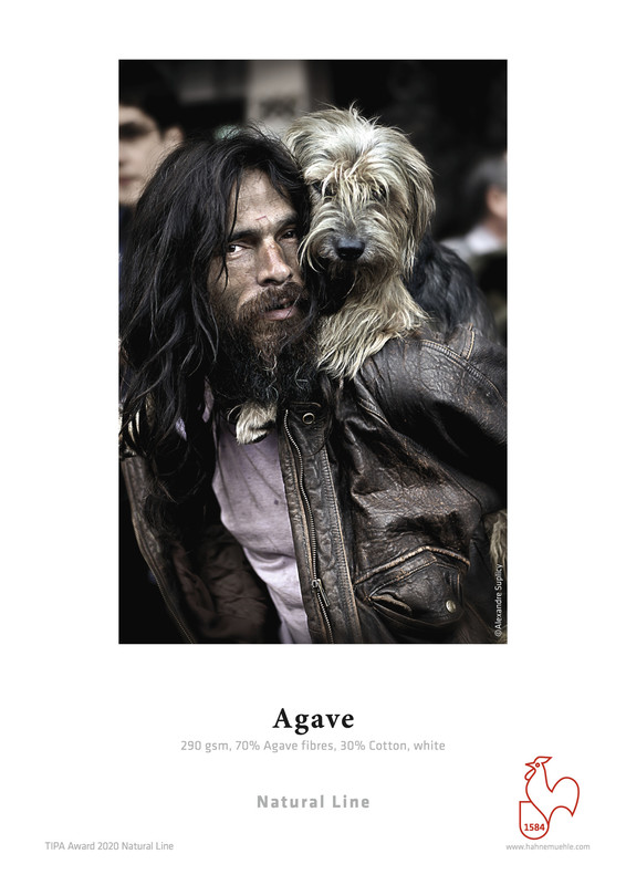 Hahnemühle Agave ergänzt die Natural Line durch ein FineArt Inkjet Papier, das aus den Fasern der Agave hergestellt wird. Die sogenannten Sisalfasern bilden mit 70% das Grundgerüst dieses besonderen, umweltbewussten FineArt Inkjet Papiers. Das Basismaterial besticht mit seinem hellweißen Naturton und ist frei von optischen Aufhellern. Die grobe, aber dennoch sanft ausgeprägte Oberflächentextur verleiht dem Motiv eine wunderbare Tiefenwirkung und überzeugt mit einer angenehm weichen Haptik. Die matte Premium-Inkjet-Beschichtung garantiert eindrucksvolle Druckergebnisse mit hervorragender Farb- und Detailwiedergabe, tiefem Schwarz und besten Kontrasten. Hahnemühle Agave ist säure- und ligninfrei und erfüllt höchste Anforderungen an die Alterungsbeständigkeit. Das Zusammenspiel aus besonderen Faserrohstoffen, hellweißem Naturton, ausgewogener Oberflächenstruktur und gewohnt hoher Druckqualität ergibt ein exklusives FineArt Inkjet Papier, das vielseitig einsetzbar ist.